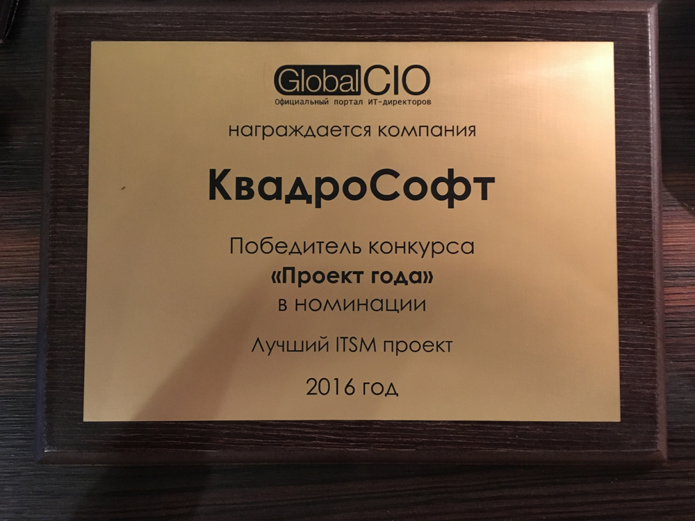 По итогам 2016 года проект ООО "КвадроСофт" по "Внедрению автоматизированной подсистемы управления ИТ и сервисным обслуживанием ОАО «Банковский процессинговый центр»" был номинирован на звание - "Лучшего ITSM проекта". В начале 2017-го были подведены итоги голосования, по результатом которого ООО "КвадроСофт" стала победителем.