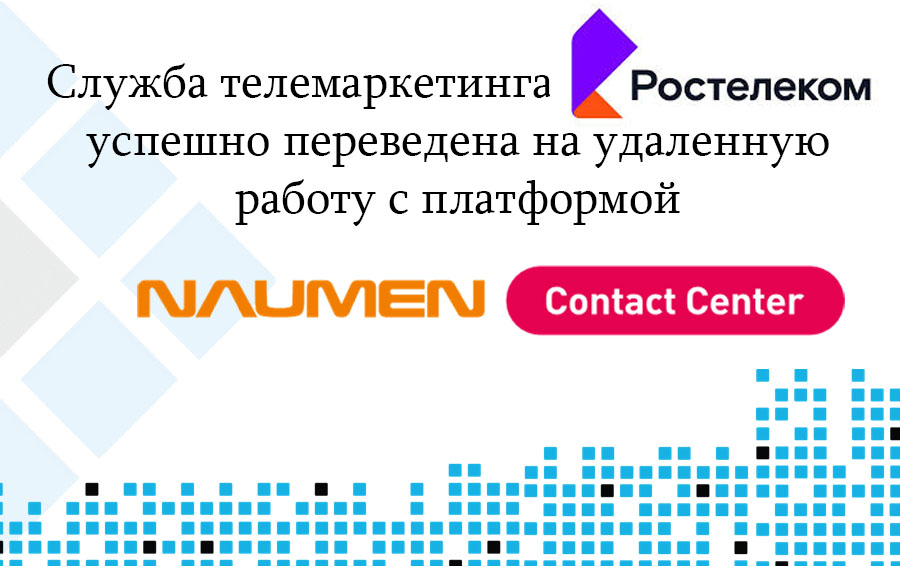 Служба телемаркетинга «Ростелекома» так и поступила. В самые короткие сроки на удаленную работу было переведено более 900 специалистов службы телемаркетинга по всей России. Для организации дистанционной работы были задействованы технологии NAUMEN.
