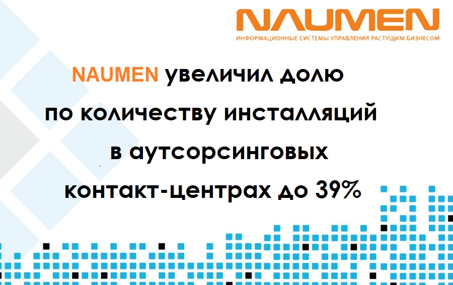 По данным исследования международного консалтингового агентства iKS-Consulting «Рынок аутсорсинговых контактных центров в России 2020», компания NAUMEN укрепила лидирующие позиции по общему количеству инсталляций в аутсорсинговых контакт-центрах (АКЦ) с долей рынка 39%.